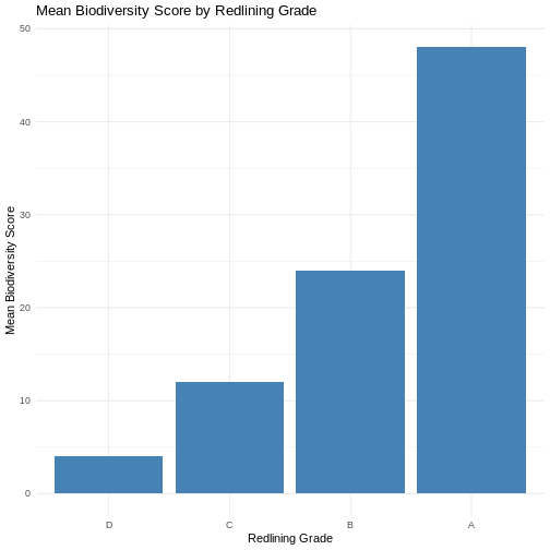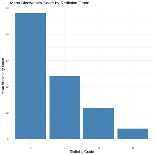 title = "Mean Biodiversity Score by Redlining Grade",