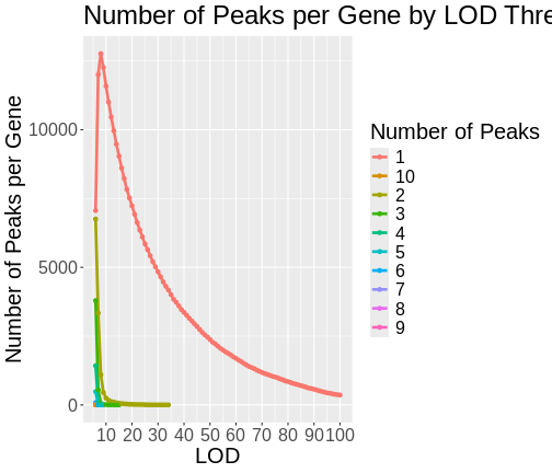 As you can see from the plot above, most peaks have LODs less than 10. However, about 12,000 peaks have LODs over 10. As we increase the LOD score, we see that fewer genes have high LODs. Let’s look at how many peaks each gene has as we increase the LOD threshold.