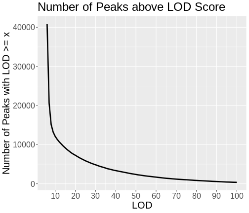 labs(title = "Number of Peaks per Gene by LOD Threshold",