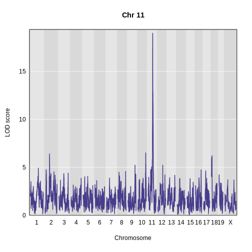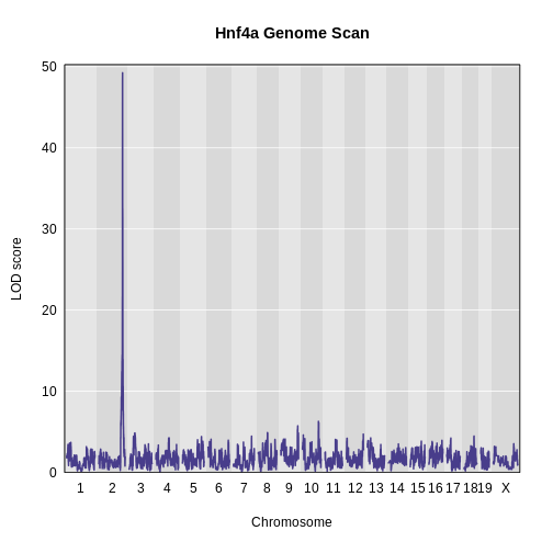 First, we need to pass in the chromosome, position, and LOD score of the QTL at which we are mapping. Remember, in a mediation scan, we map a phenotype at ONE locus and use different genes as covariates.