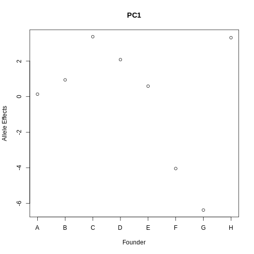 plot(1:8, pc1_eff$coef[1:8], xaxt = "n", main = "PC1", xlab = "Founder",