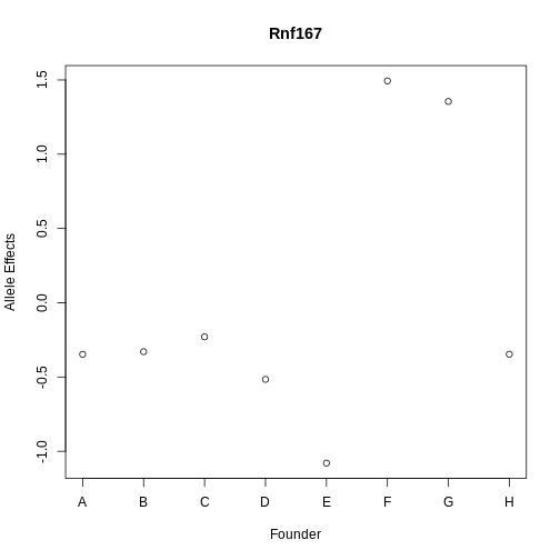 Next, let’s look at the allele effects of the gene with the highest LOD increase, Rnf167.