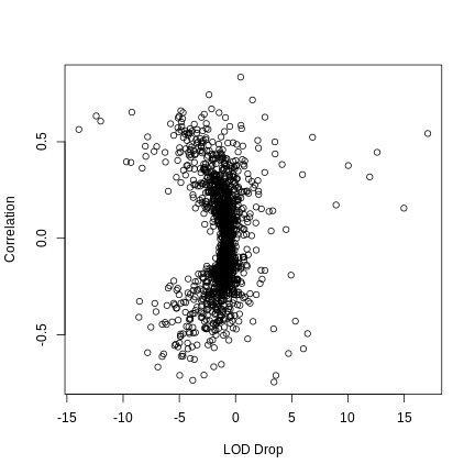 plot(med_hot$lod_drop, cor_11, xlab = "LOD Drop", ylab = "Correlation")