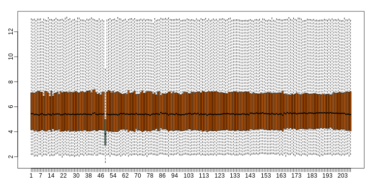 boxplot(ge,range=0,names=1:ncol(e),col=ifelse(1:ncol(ge)==49,1,2))