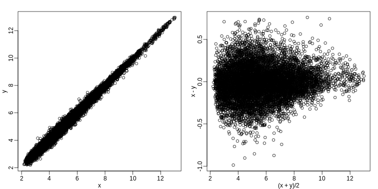 Scatterplots and correlation are not the best tools to detect replication problems. A better measure of replication can be obtained from examining the differences between the values that should be the same. Therefore, a better plot is a rotation of the scatterplot containing the differences on the y-axis and the averages on the x-axis. This plot was originally named a Bland-Altman plot, but in genomics it is commonly referred to as an MA-plot. The name MA comes from plots of red log intensity minus (M) green intensities versus average (A) log intensities used with microarrays (MA) data.