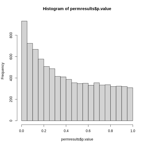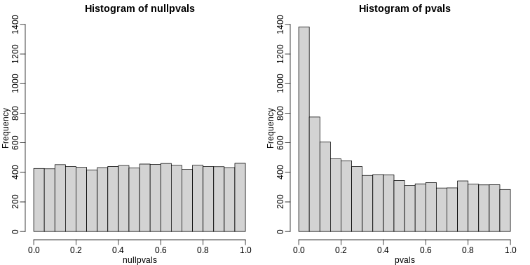 Another plot we can create to get an overall idea of the results is to make histograms of p-values. When we generate completely null data the histogram follows a uniform distribution. With our original dataset we see a higher frequency of smaller p-values.