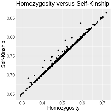 This is shown in the plot below of homozygosity versus kinship. There is a clear linear relationship between the two values and at 0.5 homozygosity, the self-kinship values is 0.75. The slope of the line is 0.5.