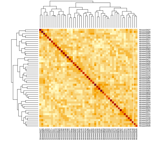 The mice are listed in the same order on both sides of the matrix. The comb-like structures are called “dendrograms” and they indicate how the mice are clustered together. Each cell represents the degree of allele sharing between mice. Red colors indicate higher kinship and yellow colors indicate lower kinship. Each mouse is closely related to itself, so the cells along the diagonal tend to be darker than the other cells. You can see some evidence of related mice, possibly siblings, in the orange-shaded blocks along the diagonal.