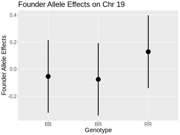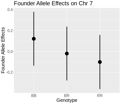 - Estimated founder allele effects can be plotted from the mapping model coefficients.