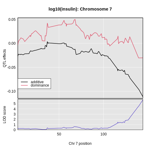 We can map the additive and dominance effects by providing a matrix of contrasts to indicate the different effects. Let’s look at the additive and dominant effects on chromosome 7 first.