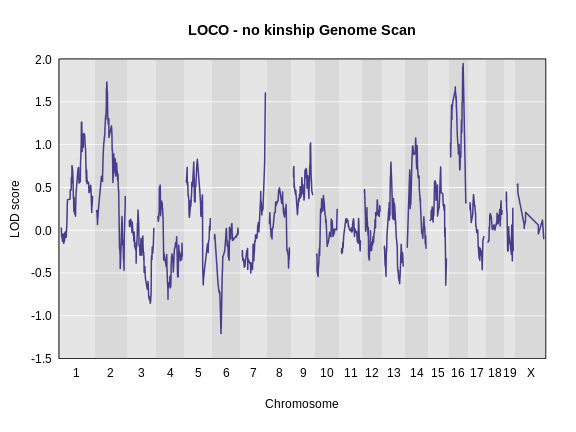 Haley-Knott regression does not consider the kinship between mice. This may increase or decrease the LOD score and least to false or missed discoveries. Including a kinship matrix which uses all of the markers in the mapping model causes a loss of power because the marker is fit twice in the model. A compromise approach is to create a separate kinship matrix for each chromosome which uses all of the markers expect those on the current chromosome. This estimates kinship while preventing the current marker from being in the model twice. The LOCO method leads to better power to identify QTL.