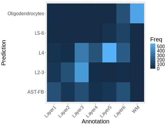 Note that there is a fairly strong correlation between the predicted and observed layers, particularly for the pairs Oligodendrocytes and WM (White Matter), L4 and Layer 4, and L2-3 and Layer 3.