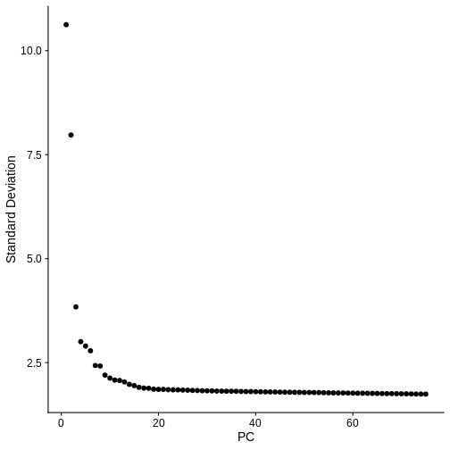method calculates 50 PCs. Let’s make an elbow plot of the number of PCs