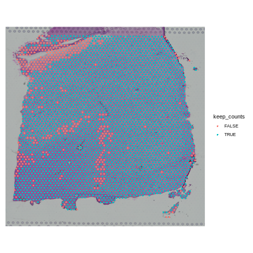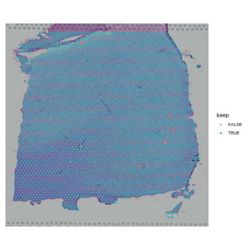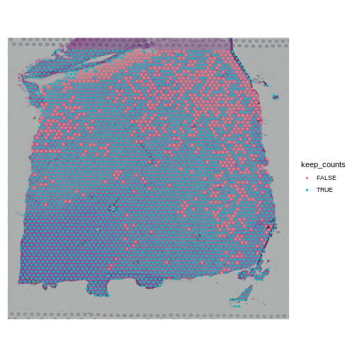 - Plot the spot overlaid on the tissue section, colored by whether you are keeping them.
