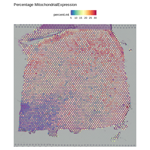 However, in spatial transcriptomics, the tissue is either frozen or formalin-fixed and there is much less mechanical disruption of the tissue. Because of this, we are skeptical of the value of filtering spots based on mitochondrial gene counts.